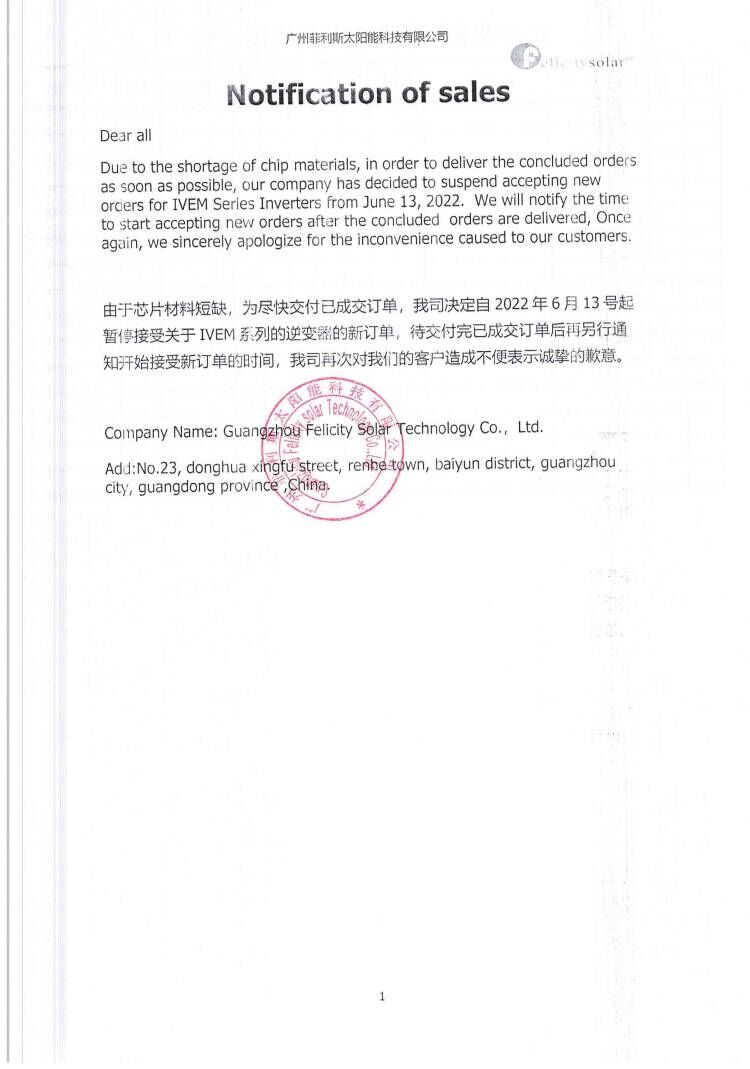 由于芯片材料短缺,为尽快交付已成交订单,我司决定自2022年6月13号起暂停接受关于IVEM系列的逆变器的新订单,待交付完已成交订单后再另行通知开始接受新订单的时间,我司再次对我们的客户造成不便表示诚挚的歉意。